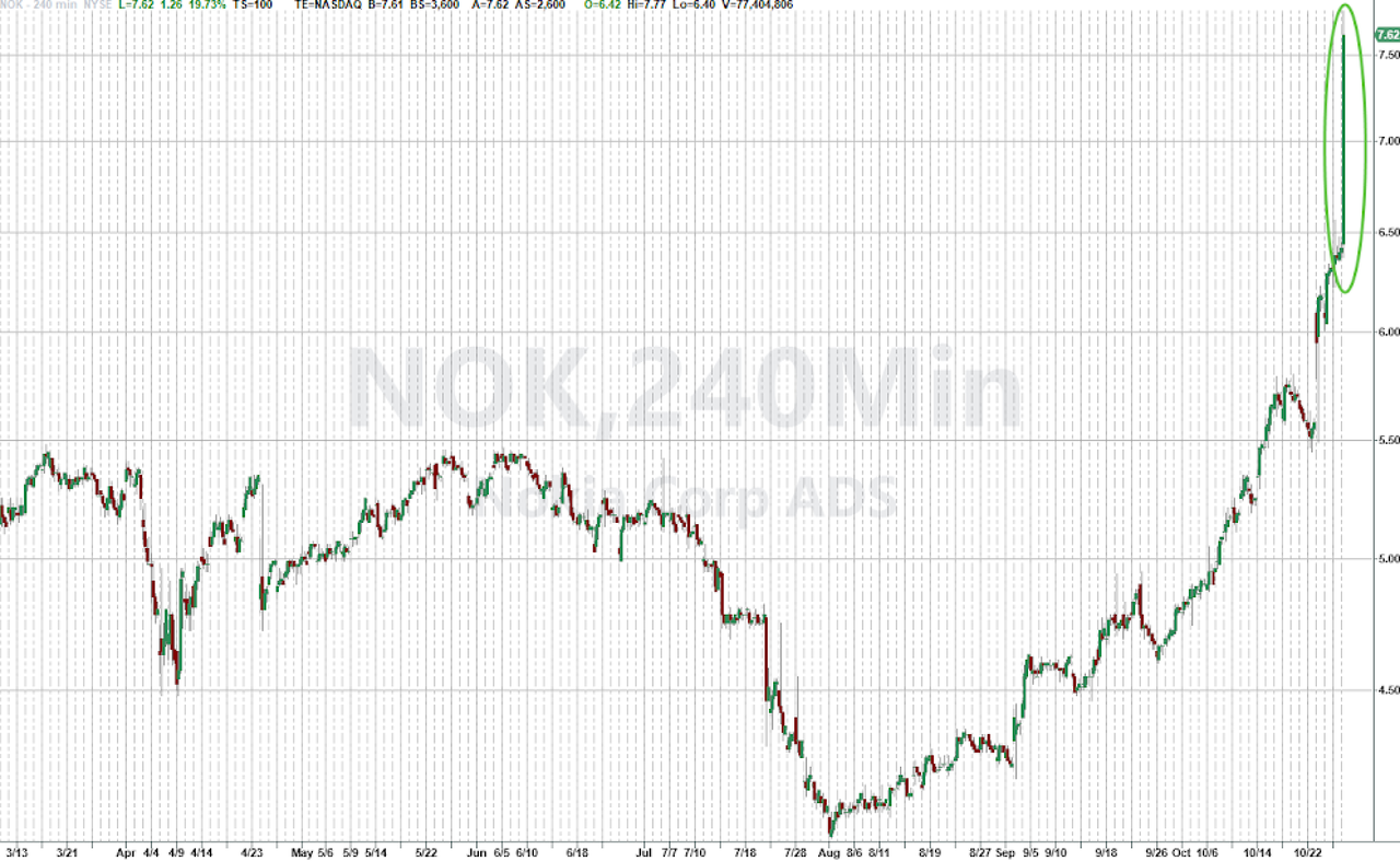 The 21% move higher is the largest intraday gain in U.S.-listed Nokia shares since January 2021.