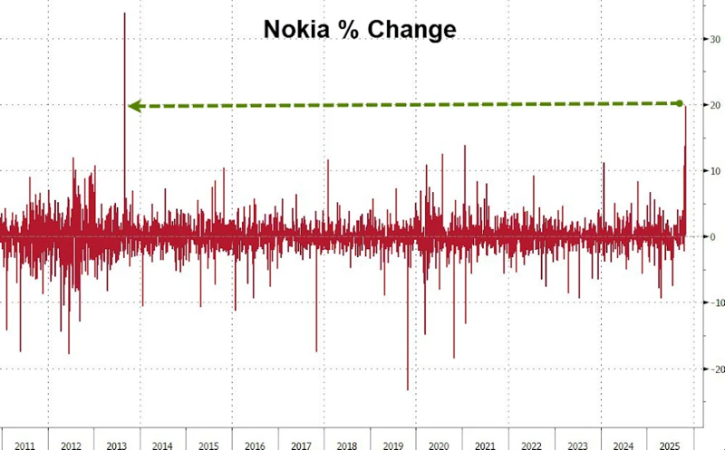 Just ahead of the lunch hour in New York, Bloomberg reported that Nvidia will invest $1 billion in Nokia, acquiring a 2.9% stake by purchasing 166 million shares at $6.01 each. The headline was enough to catapult Nokia’s shares in Europe up 17%. U.S.-listed shares were briefly halted, now up 21%.