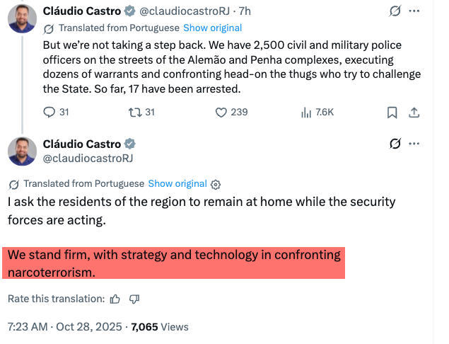 We stand firm confronting narcoterrorism,” Governor Claudio Castro wrote on X. He said 2,500 security personnel and 32 armored trucks were a part of the operation across the Alemao and Penha favela regions.