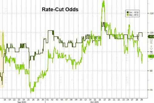 The market has grown more dovish since the last Fed meeting, now fully pricing in a 25bps cut today (and is almost certain that December will see another 25bps cut)…