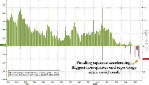 - The Fed announced that QT (aka the run-off of Treasury securities from the Fed’s balance sheet currently capped at $5 billion per month) would conclude on December 1, as also became consensus in recent days as a result of turmoil in funding markets.