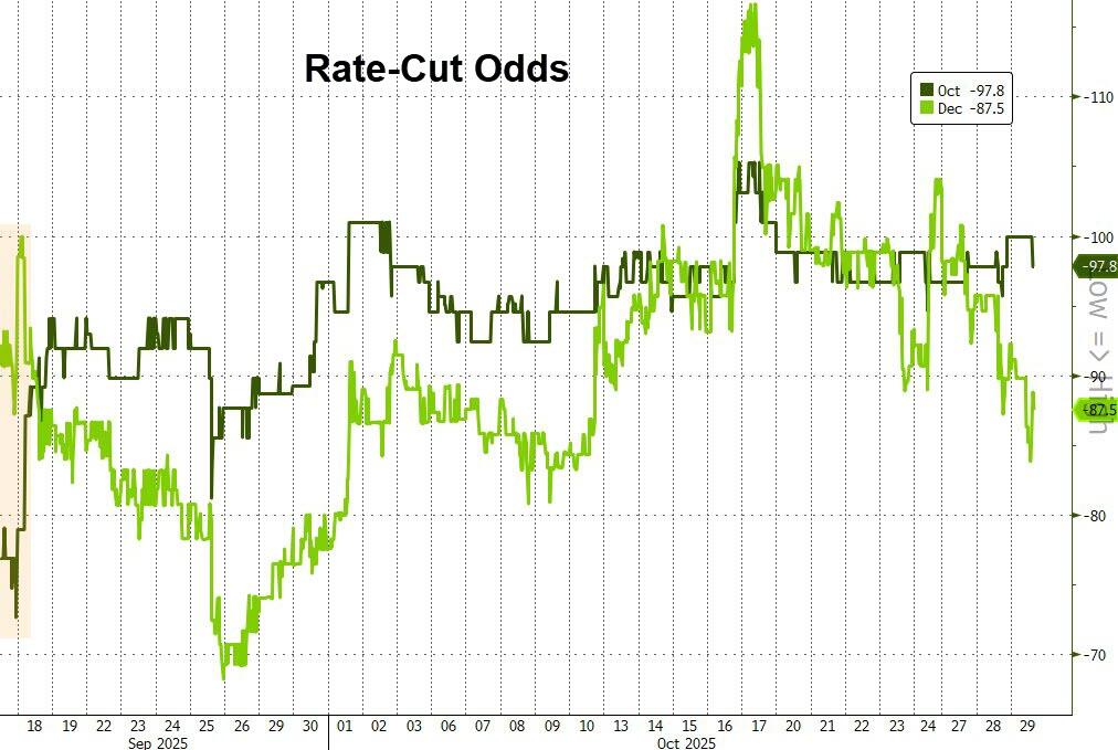 The market has grown more dovish since the last Fed meeting, now fully pricing in a 25bps cut today (and is almost certain that December will see another 25bps cut)…
