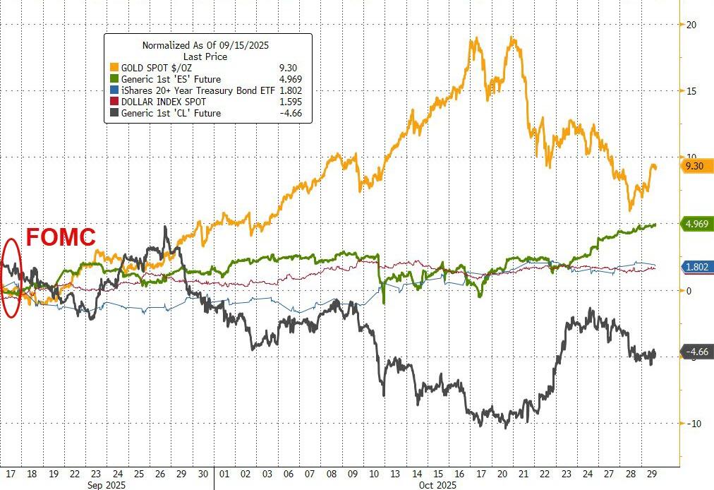 Since the last FOMC meeting (on Sept 17th), Gold has dramatically outperformed across asset-classes (even with its recent plunge) followed by US equities. Oil prices have tumbled the most while the dollar and bonds have risen in value. Bitcoin is basically unchanged since the last FOMC meeting, having collapsed after reaching record highs intramonth…