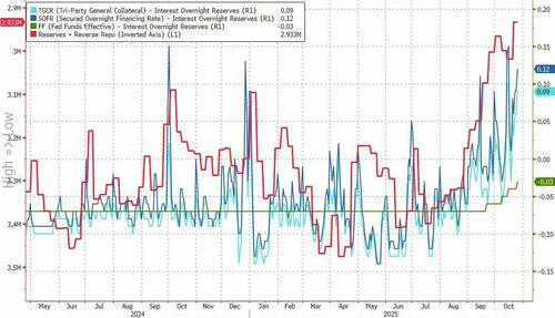 Turning to the main event, the Fed is set to cut by 25 basis points, and is likely to announce an end to Quantitative Tightening (QT) as there are increasing signs that bank reserves in the last two weeks have transitioned from an “abundant” to an “ample” level – the stopping point for QT, according to guidance from Powell (our full preview is here).