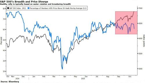 There are some clouds in the sky: the breadth of the S&P 500’s gain on Tuesday was the narrowest since at least 1993, replicated overnight by Japan’s benchmark Nikkei 225, adding to the theme of concentration with a strong gain generated by a relatively low number of advancers. BofA technical analyst Paul Ciana notes “the ghosts and goblins of Sept-Oct are fading away as we head into the most wonderful time of year,” while cautioning healthy bull markets are built on breadth and rotation “both of which have waned.”