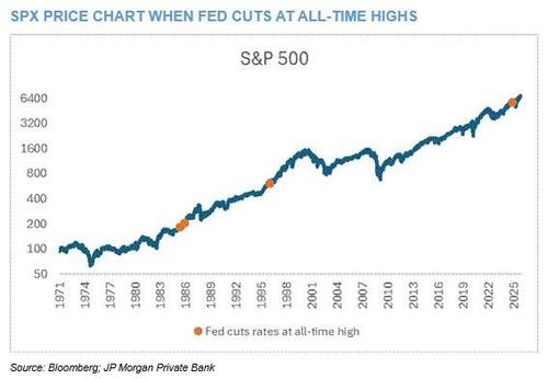 Looking ahead, JPMorgan this morning reminds us that “today will be the fifth time that the Fed cuts rates with the S&P 500 at all-time highs. All prior instances the S&P 500 was higher a year later with an average return of 20%. The worst one-year return was a 15% gain which occurred last year.”