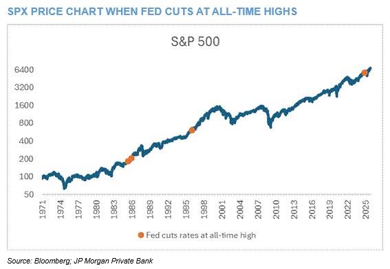Looking ahead, JPMorgan this morning reminds us that “today will be the fifth time that the Fed cuts rates with the S&P 500 at all-time highs. All prior instances the S&P 500 was higher a year later with an average return of 20%. The worst one-year return was a 15% gain which occurred last year.”