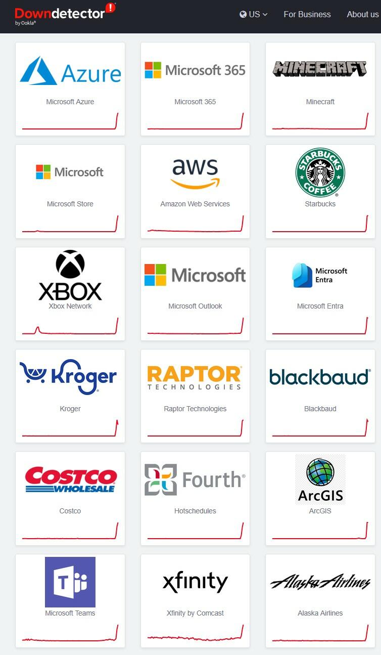 Users are reporting outages at Amazon.com, AWS, Microsoft (Azure, 365, Store, Teams, Entra), the XBOX network, Comcast’s xfinity, Starbucks, and Alaska Airlines, to name a few.