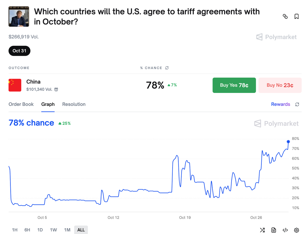 Cryptocurrency-based prediction market Polymarket has odds of around 78% that Trump secures a China trade deal tomorrow.