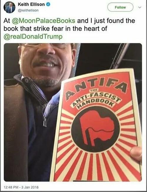 Ironically, when many on the left are not denying its existence, they are rallying their members or actually selling Antifa merchandise. As noted above, former Democratic National Committee deputy chair Keith Ellison — now the Minnesota attorney general — proclaimed that Antifa would “strike fear in the heart” of Trump.