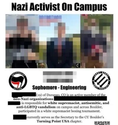 The Antifa flyer accused the sophomore of being “an active member” of “neo-Nazi organizations” and is “responsible for white supremacist, antisemitic, and anti-LGBTQ vandalism on campus and across Boulder,” and also “participated in a white supremacist boxing tournament.” The Boulder Students for a Democratic Society reportedly shared the flyer on their social media. They encouraged followers to “share widely” and tag the school to notify them of a “Nazi activist on CU Boulder campus.”