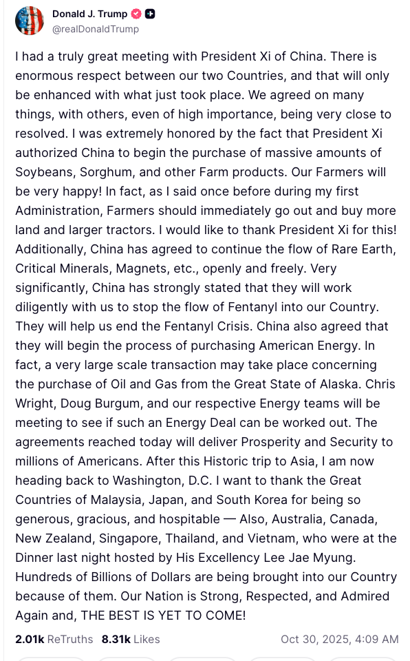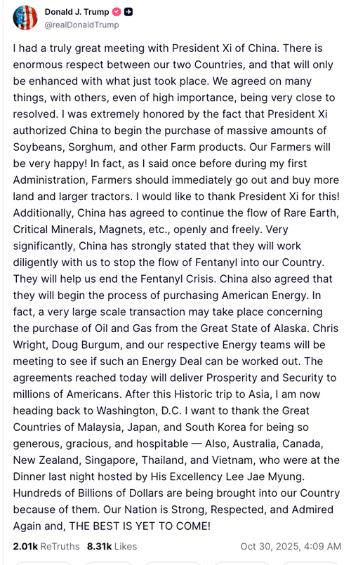 Trump Hails “Amazing” Xi Meeting – Trade Concessions, U.S. Soybean Farmers Win, China Eases Rare-Earth Controls