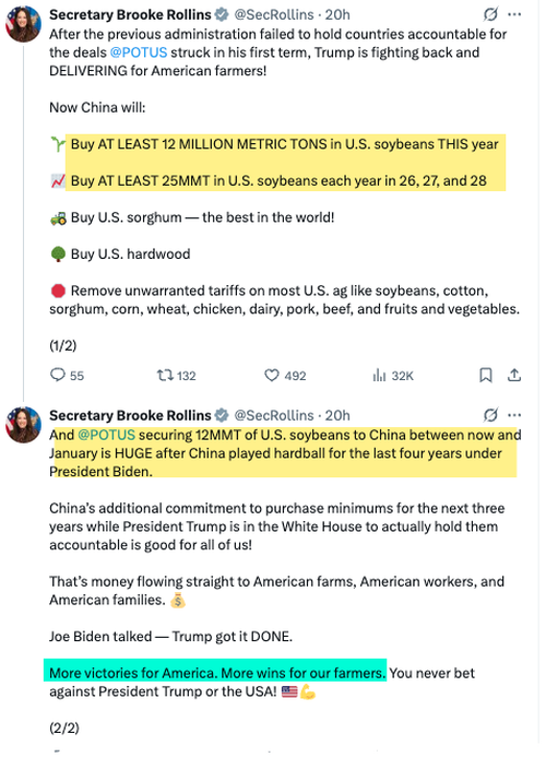 🚨 WOW! President Trump got Chinese President Xi to agree to buy “12 MILLION METRIC TONS of American soybeans this season.”