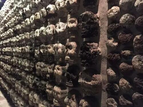 “I remember that they had in a plaza, where there were some shrines, so many places of dead skulls, which could be counted, according to the concert as they were set, that when they appeared they would be more than one hundred thousand; and I say again about one hundred thousand. And in another part of the square were as many rows of bones without meat, bones of the dead, that could not be counted; and they had in many beams many heads hanging from one part to another. And keeping those bones and skulls were three priests, who, as we understood, were in charge of them. . . . “