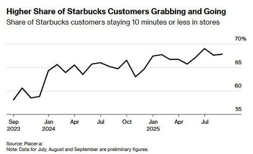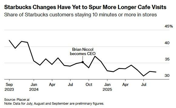 Starbucks is struggling to keep customers in its cafes, even after spending heavily to make stores more inviting. New data from Placer.ai shows the share of visits lasting more than 10 minutes has dropped from over 40% in 2023 to roughly one-third today, according to Bloomberg.