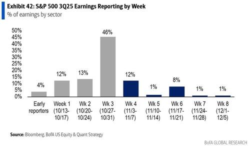 Looking at just the US, there are several speaking engagements by Fed officials this week, including events with Vice Chair Jefferson on Friday, Governor Waller on Thursday, and New York Fed President Williams on Thursday and Friday. As Goldman notes, several data releases will be postponed this week because of the government shutdown, including the construction spending, trade balance, factory orders, JOLTS, productivity and costs, wholesale trade, and employment reports. The Department of Labor will also postpone the official release of the jobless claims report if the government shutdown continues through Thursday, but preliminary state-level claims data will likely be available as in previous weeks. Assuming the shutdown ends in mid-November, the release of the September employment report will be published a few days after reopening. The statistical agencies will announce new release dates for the other postponed releases in advance. If the BLS decides to release the October employment report, expect its release along with the November report either on schedule on December 5 or delayed by one week.