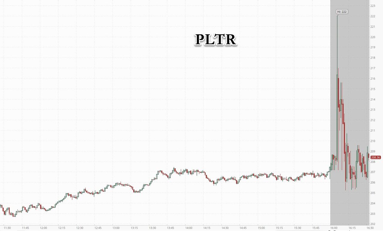 Palantir, which after Nvidia is perhaps the current AI bubble’s most symbolic stock trading at a forward PE of over 300x, reported Q3 earnings which saw the company beat on the top and bottom line and boosted its revenue guidance for the full year; beating the average analyst estimate, sending the stock to fresh all time highs although the after hours action has been decidedly soggy with the stock first surging 7% before reversing all gains.