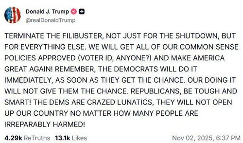 Meanwhile, the president has renewed calls for Senate Republicans to eliminate the legislative filibuster. In a post over the weekend, he wrote: “TERMINATE THE FILIBUSTER, NOT JUST FOR THE SHUTDOWN, BUT FOR EVERYTHING ELSE… REPUBLICANS, BE TOUGH AND SMART! THE DEMS ARE CRAZED LUNATICS, THEY WILL NOT OPEN UP OUR COUNTRY NO MATTER HOW MANY PEOPLE ARE IRREPARABLY HARMED!”