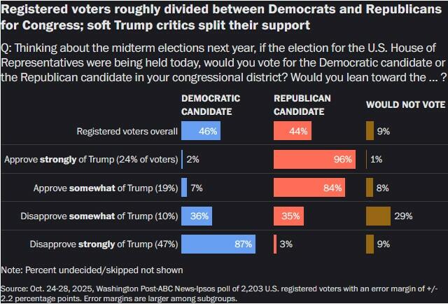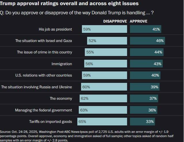 Meanwhile President Donald Trump’s approval rating continues to weigh heavily on Republicans. A Washington Post–ABC News–Ipsos poll found that 41% of Americans approve of his handling of the presidency, compared with 59% who disapprove. Among independents, only 30% approve, while 69% disapprove. On the economy – long seen as Trump’s strongest issue – he fares worse, with 37% approving and 62% disapproving. “These Trump economic numbers are in line with other recent polls,” one report noted. “This is a serious problem for Republicans.”