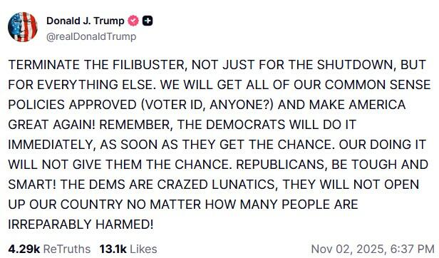 Senate Majority Leader John Thune, however, has maintained his opposition to ending the filibuster. His staff said “the majority leader’s position hasn’t changed.” Senate Majority Whip John Barrasso and Sen. Lindsey Graham (R-SC), both Trump allies, echoed that stance. Graham told reporters in Las Vegas over the weekend that there was “no point in ending the filibuster because…the shutdown will end this week.”