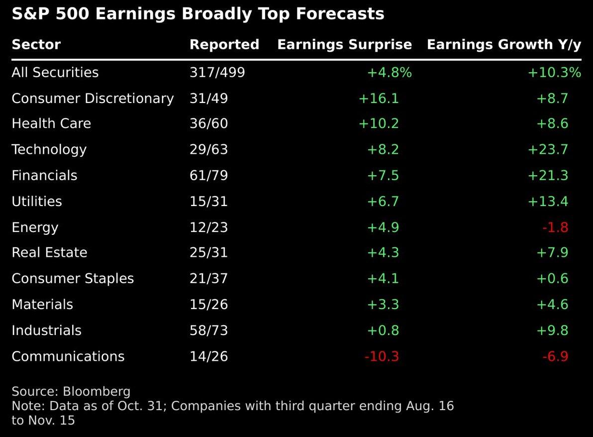 Out of the 318 S&P 500 companies that have reported so far in the earnings season, 83% have managed to beat analyst forecasts, while 13% have missed. The S&P 500 is on pace for 13% earnings growth, up from 7.2% expected at the beginning of October. US earnings are surging across the board with the median stock in the Russell 3000 tracking its fastest growth since 3Q21, Morgan Stanley said, supporting a view that a new cycle and bull market began in April. Goldman Sachs’ David Kostin sees earnings beats as unprecedented except the Covid reopening in 25 years of data.