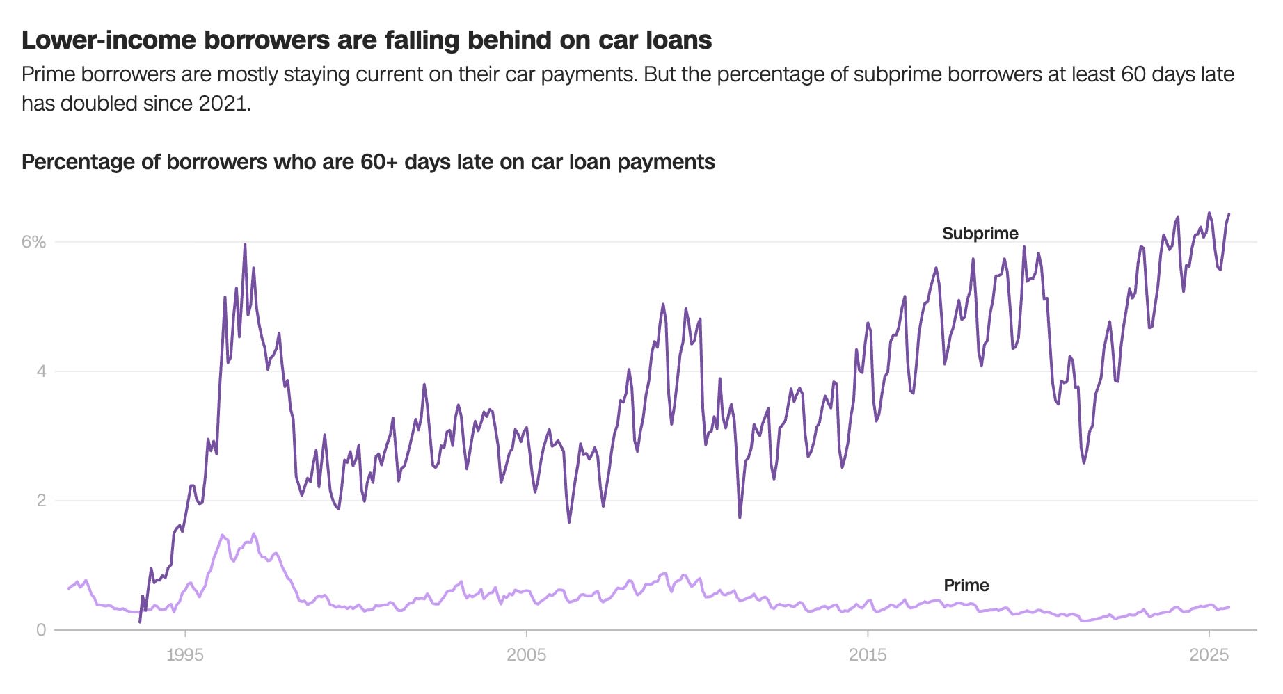 Among borrowers with weaker credit, more than 6% are over two months behind — worse than during prior recessions — and nearly one in ten is sliding into default. People generally sacrifice everything else other than their house before they lose their cars. When transportation — the thing that gets you to work and keeps life functioning — becomes unaffordable, that’s not a marginal data point. That’s financial strain turning into lifestyle disruption.