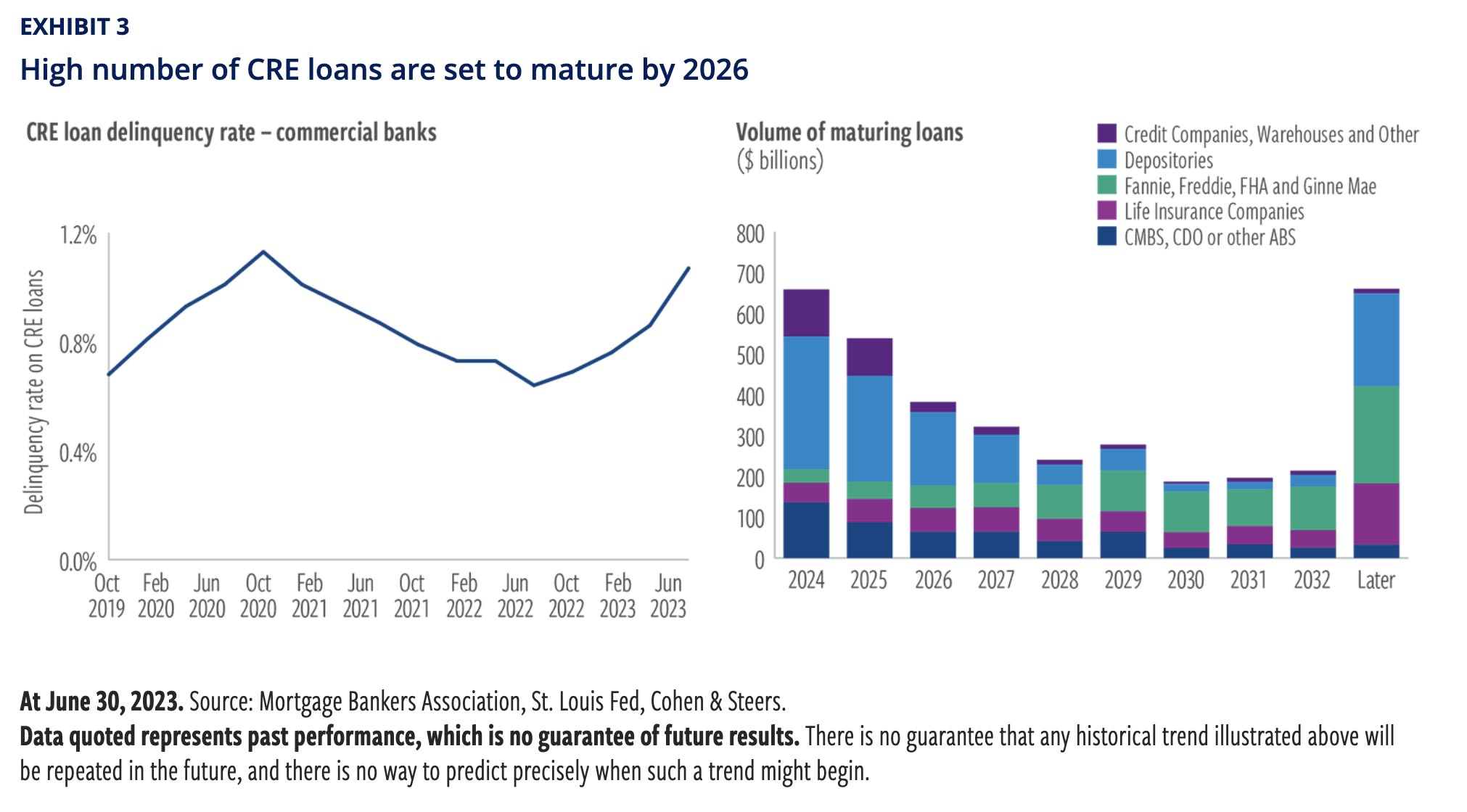 With valuations under pressure and a wave of loan maturities approaching by 2026, according to Cohen & Steers, lenders will likely face rising delinquencies and the need to boost reserves—especially where office loans or recently underwritten, higher-leverage deals are concentrated.