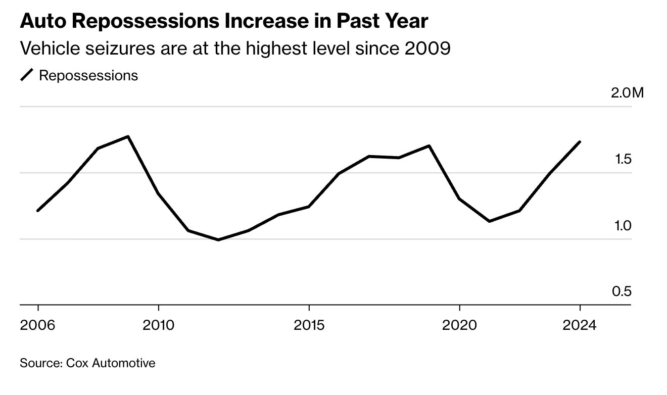 Bloomberg recently noted that more than 1.7 million cars were repossessed in 2024, the most since the post-crisis period. That’s more than a 40% jump from 2022, driven by the end of pandemic forbearance, persistent inflation, and sharply higher interest rates. A typical monthly payment now sits in the mid-$700s (this is almost my mortgage payment on my studio apartment in Philadelphia), and many subprime borrowers are paying rates above 10%. What used to be a manageable necessity has become a financial wedge.