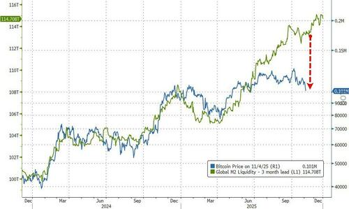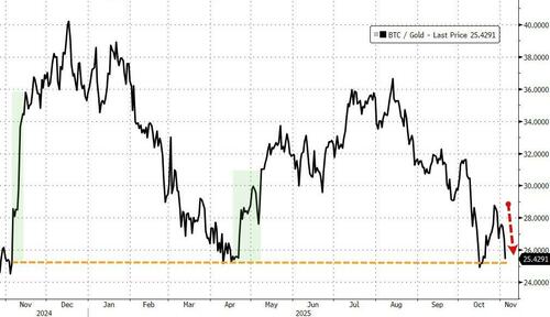 After its worst October performance in nearly a decade, and sentiment among traders already reeling from a historic liquidation event last month, Bitcoin has accelerated losses today, breaking back below its 200DMA and testing down to $101k for the first time since June…