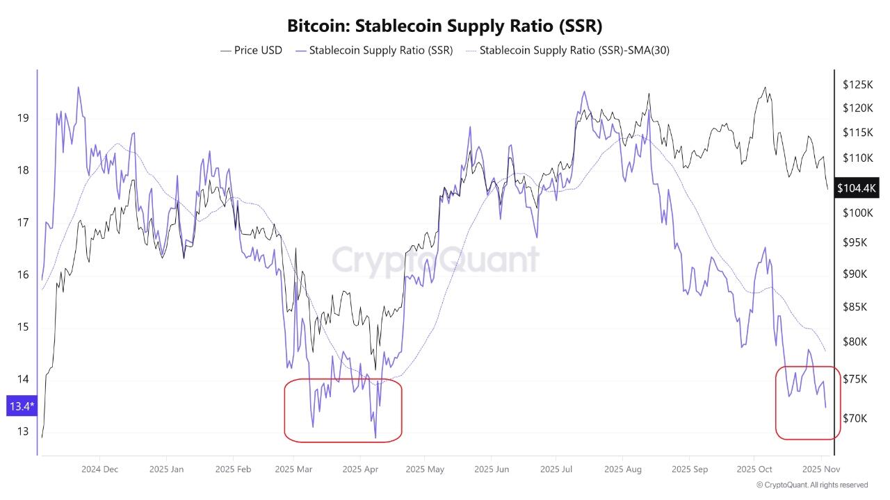 Data from CryptoQuant suggested that the Stablecoin Supply Ratio (SSR) has dropped back to the 13–14 range, the same zone seen before Bitcoin’s rebound earlier this year. Historically, this level has marked liquidity turning points, where increasing stablecoin balances signal rising “buying power” on the sidelines.