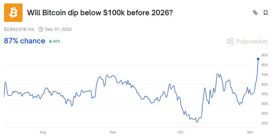 According to updated Polymarket data, there’s now an 87% chance of the Bitcoin price falling below $100,000 before 2026…