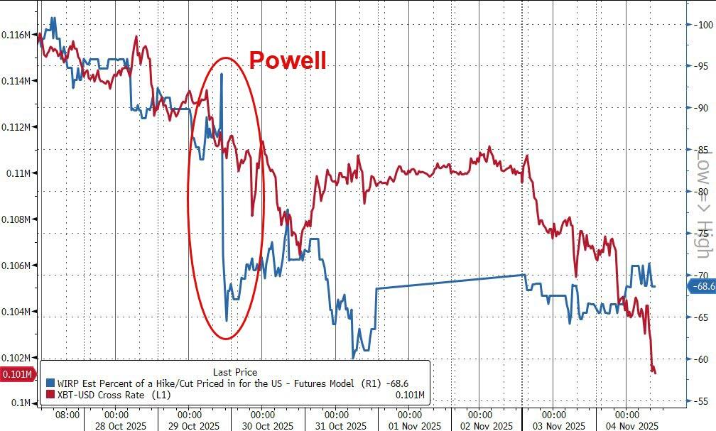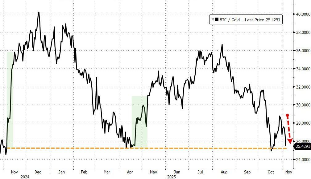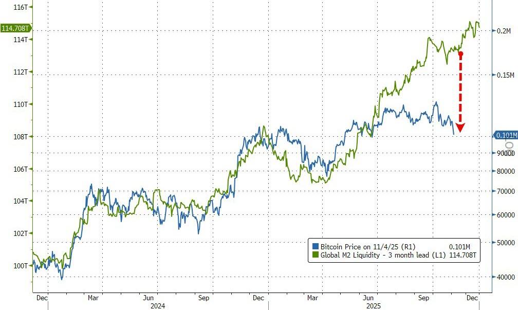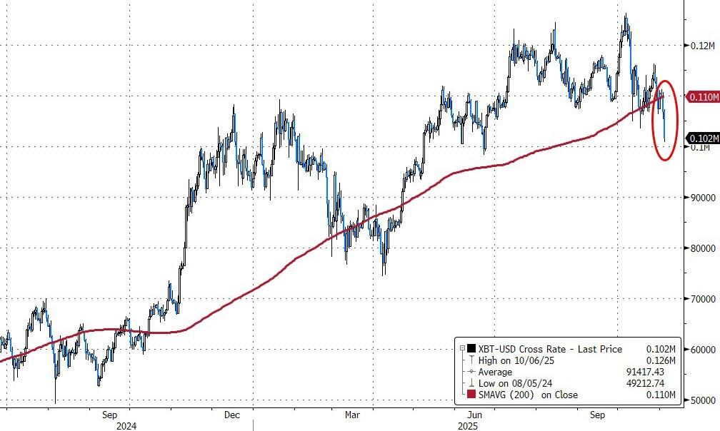 After its worst October performance in nearly a decade, and sentiment among traders already reeling from a historic liquidation event last month, Bitcoin has accelerated losses today, breaking back below its 200DMA and testing down to $101k for the first time since June…