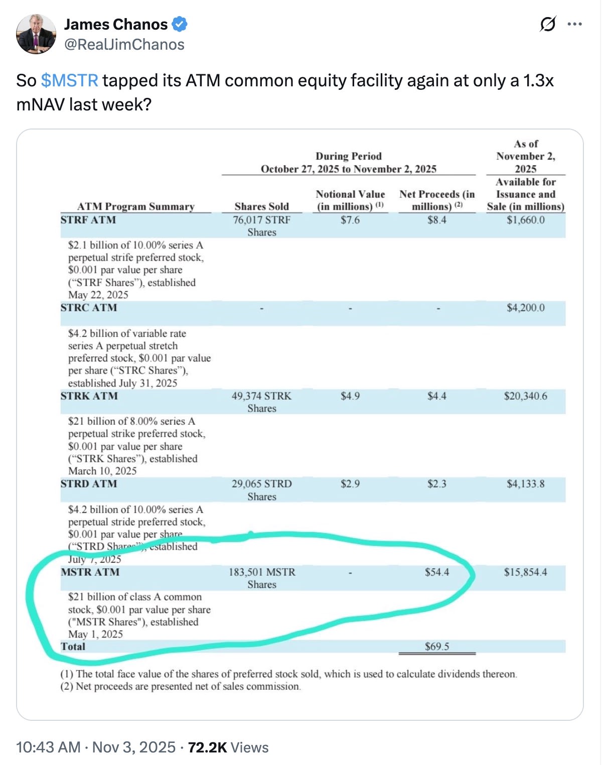 Short-seller Jim Chanos has been warning about this structure for years. Chanos’ core point remains timely: as long as the company borrows or dilutes shareholders to accumulate Bitcoin, it is exposed not only to BTC price risk, but to the same liquidity crunches that force other leveraged holders to capitulate when conditions turn.