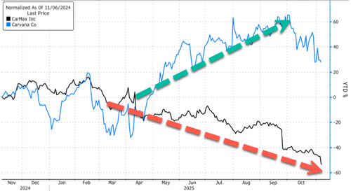 The combination of today’s news sent shares tumbling as much as 15%, pushing year-to-date losses to over 57%. Meanwhile, online used-car retailer Carvana has gained more than 50% so far this year.