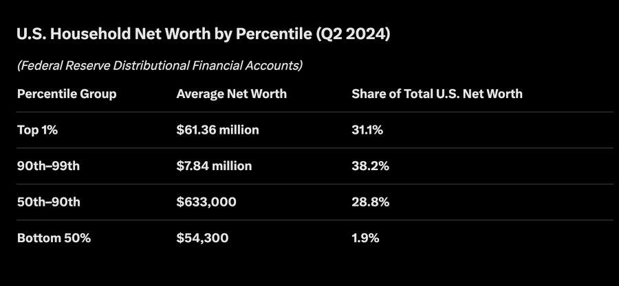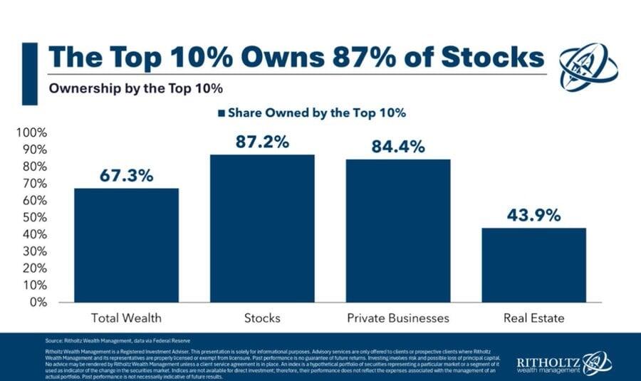 “The top 10% of US households now hold 87% of all US stocks owned by households, with the top 1% alone owning 50%. By comparison, the remaining 90% hold just 13%, while the bottom 50% hold only 1%. The wealth gap has never been bigger.”
