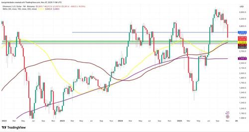 This is the area between $3,000 and $3,150, defined by the 100-week and 50-week simple moving averages (SMAs), respectively. These trendlines have supported the price since July.