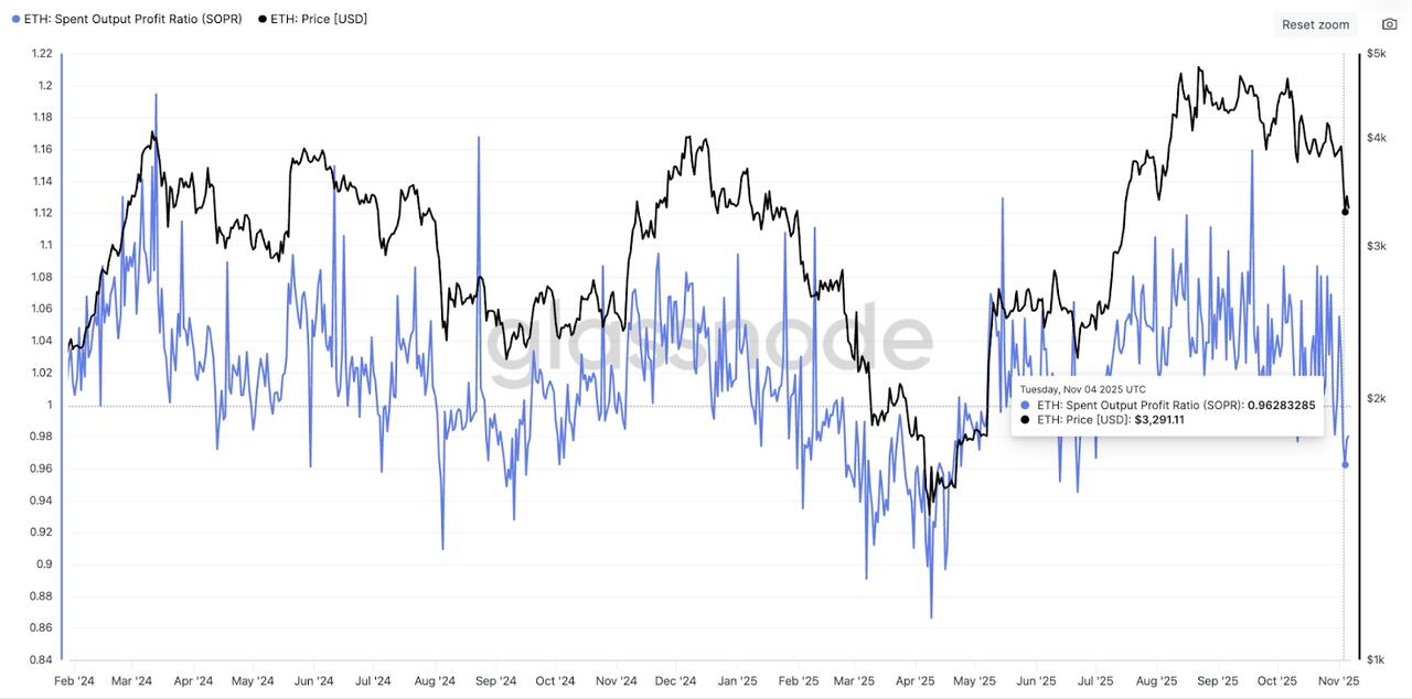 On-chain data reveals that Ether’s Spent Output Profit Ratio (SOPR) has dropped to 0.96, suggesting ETH investors are selling at a loss.