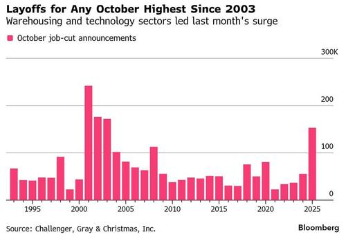 Noise around the health of the Jobs market in the US has increased in recent sessions, with a Bloomberg story out this morning reporting US companies announced 153k job cuts last month, triple the amount during the same month last year, and the most for any October since 2003. The story, citing data from Challenger, Gray & Christmas, pointed to AI adoption, softening consumer and corporate spending, and rising costs as the primary drivers of belt-tightening and hiring freezes.