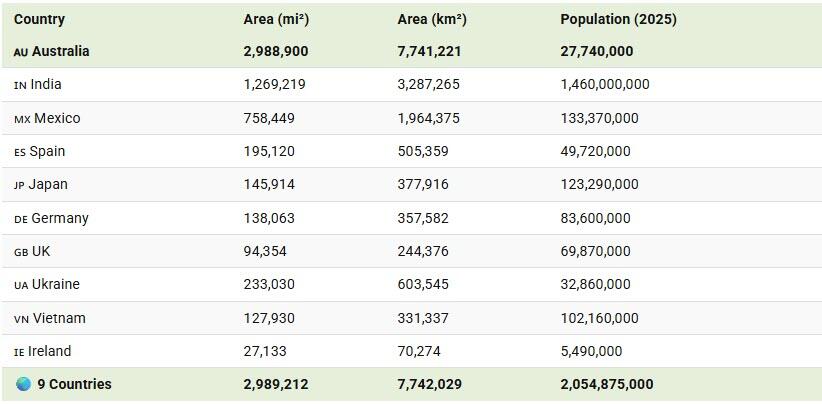 Covering nearly 3.0 million square miles (7.73 million km²), Australia is the sixth-largest country, sitting just behind Brazil.