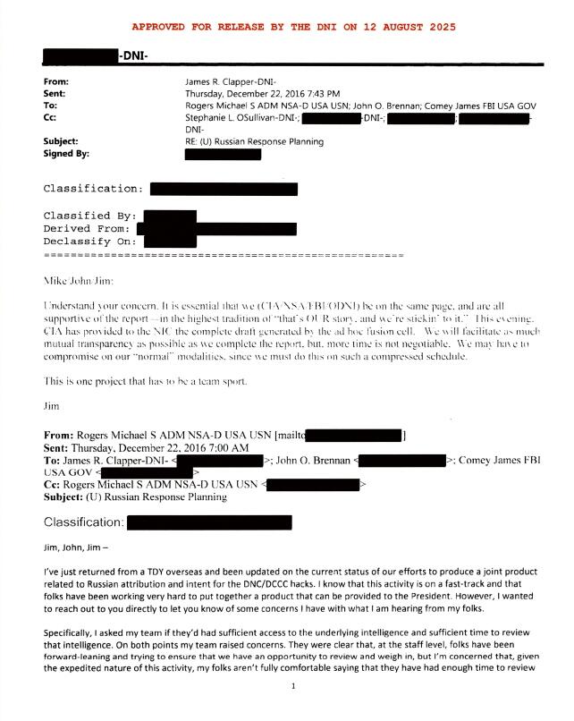 Tulsi Gabbard retrieved and released a host of documents relating to the fraudulent ICA construct, including the use of the Steele Dossier. Gabbard also declassified and released the email from former DNI James Clapper who was pressuring NSA Director Admiral Mike Rogers to go along with the team goal, and blame Russia: