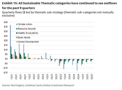 All sustainable thematic categories, climate, human development, etc., have recorded nonstop outflows for nine consecutive quarters.