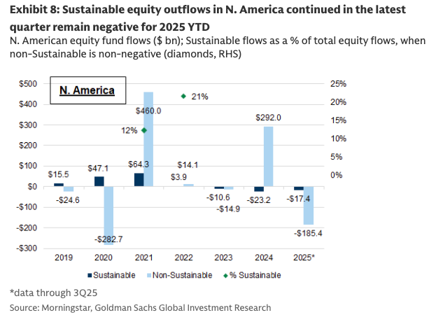 Sustainable equity funds saw outflows in 3Q25 (-$70.1 bn), largely driven by redemptions from select funds in July (Exhibit 6).
