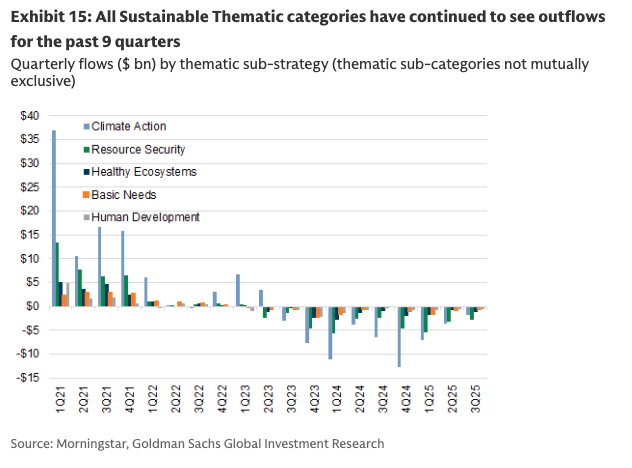 All sustainable thematic categories, climate, human development, etc., have recorded nonstop outflows for nine consecutive quarters.