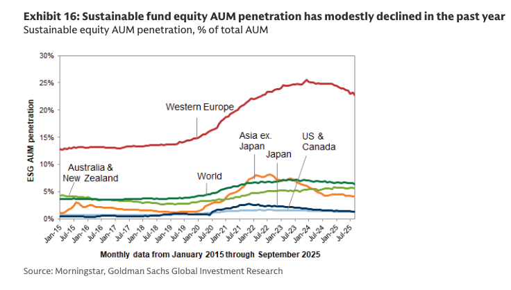 “Sustainable fund equity AUM penetration” refers to the percentage of total equity assets under management (AUM) invested in ESG-labeled funds. The data below shows that this phenomenon has largely lost momentum after globalist Wall Street bankers drove the ESG bubble into hyperdrive during the Biden–Harris regime era.
