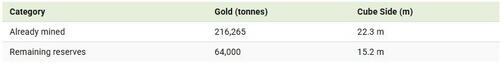 Meanwhile, the world’s proven, economically recoverable gold reserves total around 64,000 tonnes, forming a smaller 15-meter cube.