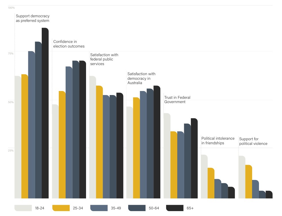 When asked about the statement “democracy is preferable to any other kind of government, even if those I disagree with are elected”, 75.9% agreed, but this fell to below 70% for the 18-24 and 25-34 age brackets.