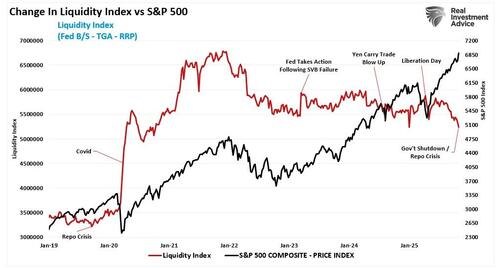 While that may sound frightening, there is a twist. If the Fed steps in to relieve repo pressure, like it did in 2019, it might trigger the opposite of a crash. In other words, the Fed’s actions to stabilize the repo market may lead to a “melt-up” in equities, where risk assets surge, not because fundamentals improve, but because liquidity returns in force. Such a conclusion is not far-fetched, as the Government shutdown has drained over $700 billion from the market, as shown by the sharp increase in the Treasury General Account.