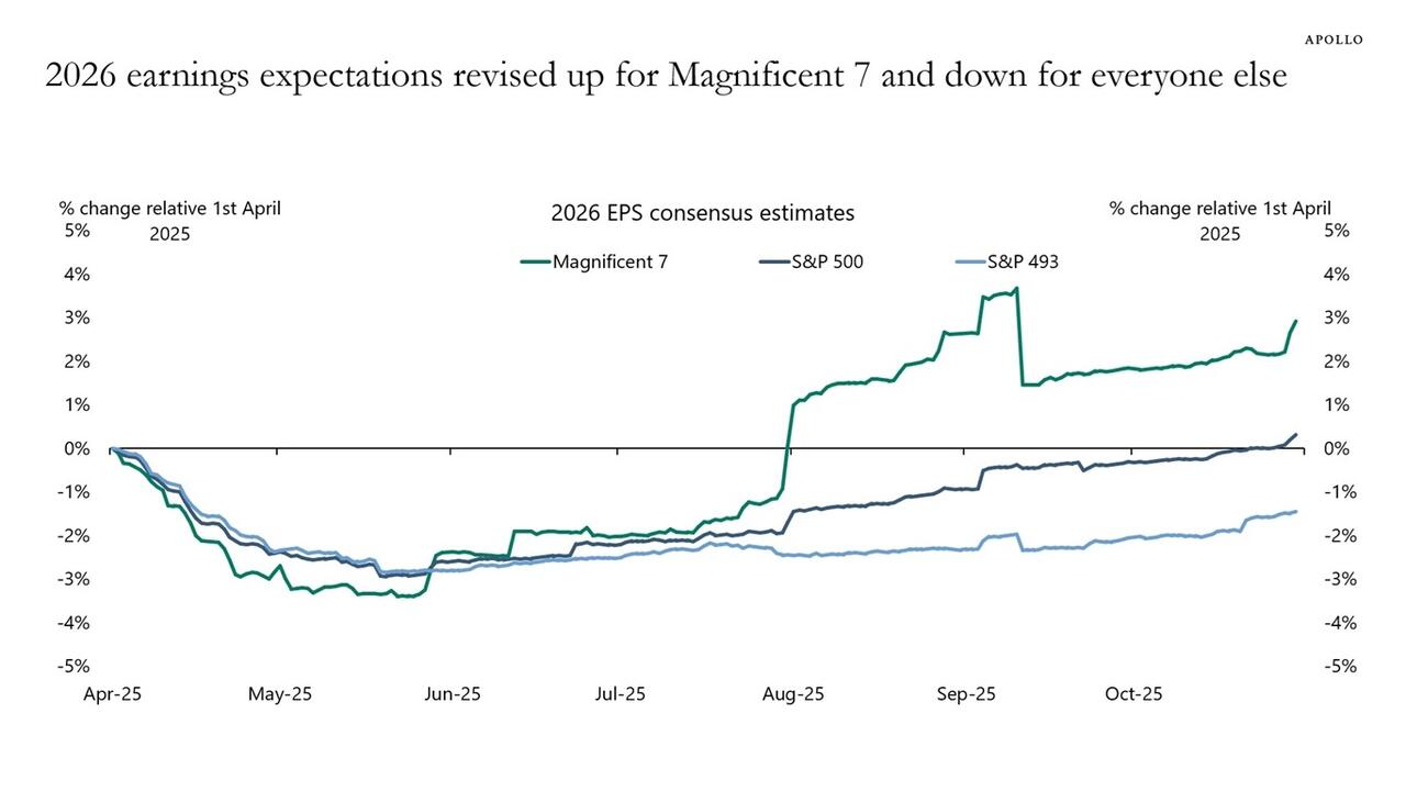 Speaking of earnings, the most notable factor is the elevated expectations of earnings growth projections heading into 2026. While there are a lot of hopes for next year, the vast majority of earnings growth next year is solely dependent on the “Magnificent 7.” Expectations are currently for negative growth from the bottom 493.