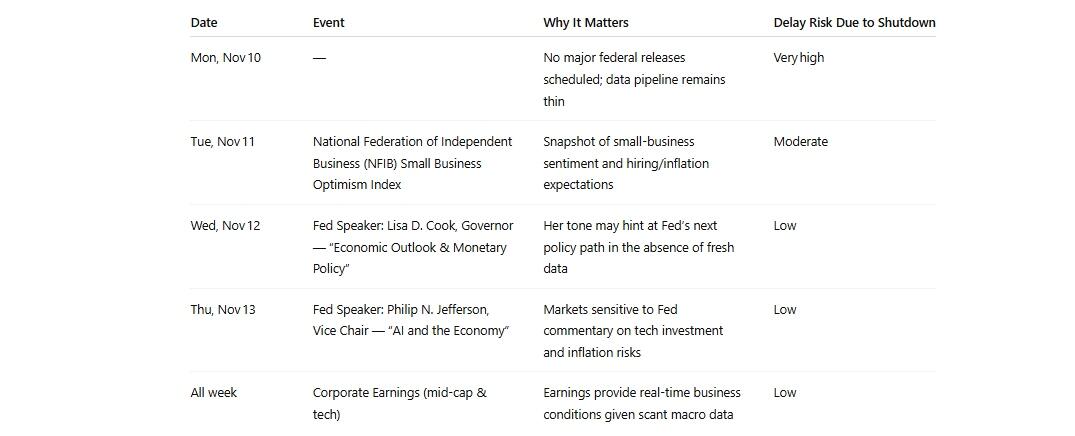 The U.S. government shutdown persists, continuing to stall many federal economic data releases. In this environment, the market’s focus shifts sharply to those reports still expected and to key central‑bank commentary. Investors will monitor what limited data is available, along with speeches from Federal Reserve officials and corporate earnings, for directional signals.