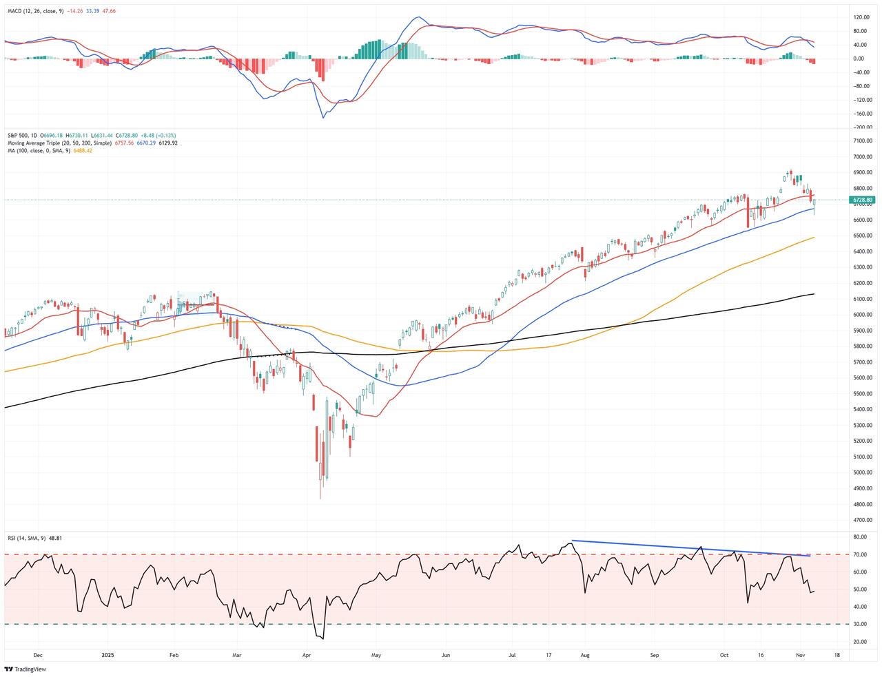 The S&P 500 closed the week at 6,728 after struggling all week to hold its ground. While the index remains in a defined uptrend and continues to trade above its 50-day and 200-day moving averages, both of which are still rising, the strength of the move is increasingly in question. Momentum remains constructive, with the MACD in a buy signal posture, and the 20-day moving average held as support. But the underlying structure of the market is weakening.